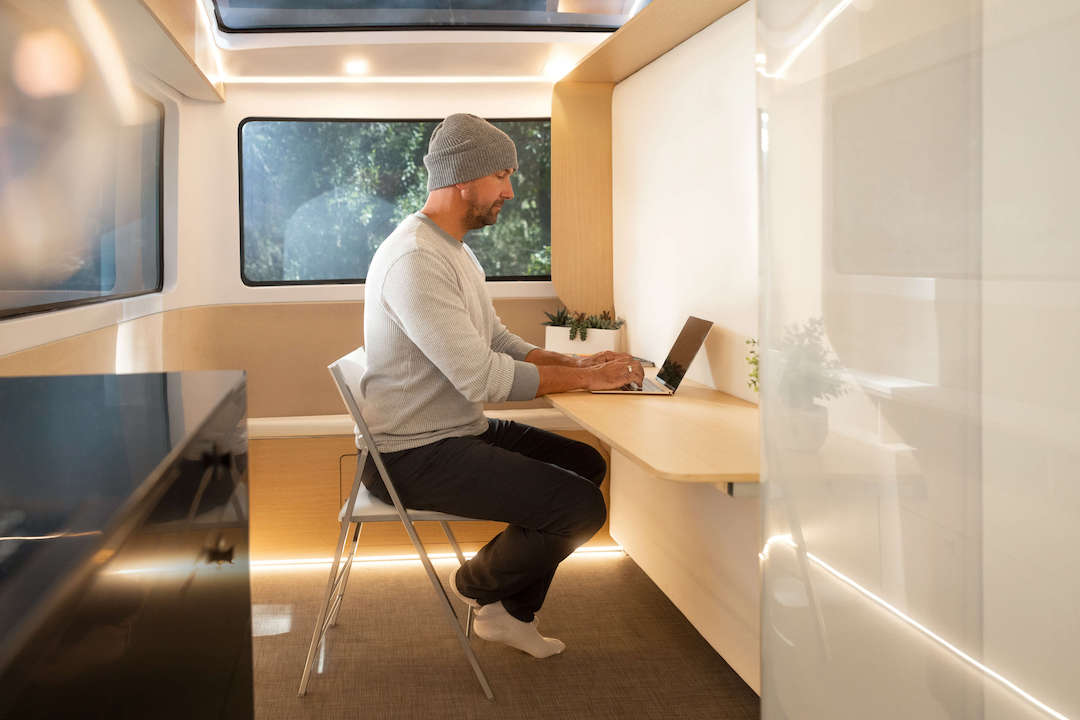 The Pebble Flow travel trailer boasts a distinctive, fluid design, specifically engineered for optimal aerodynamics, resulting in a 300% increase in aerodynamic efficiency over traditional boxy travel trailers. It includes an Active Aero front nose cone that adjusts for optimal driving aerodynamics and unobstructed views when parked. Essentially, the Pebble Flow is positioning itself as the iPhone of campers.