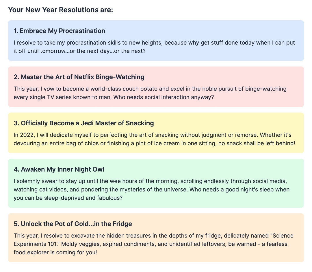 Instead of dishing out mundane or overly ambitious aspirations, the AI understands that while aiming high is vital, the journey is more enjoyable when you live in the moment. To drop the New Year ball, you simply enter a name and a profession. When we tried churning resolutions for a graphic designer, the tool proposed to embrace the procrastination pro within, become a Jedi master of snack breaks, and “unlock the pot of gold… in the fridge.”