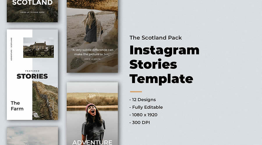 This free set includes twelve unique Story templates, suitable for personal vacations, landscape photographers, or even travel business promotions. Editable in PSD format, each template has smart objects for easy customization. It is ideal for creating eye-catching travel Stories.