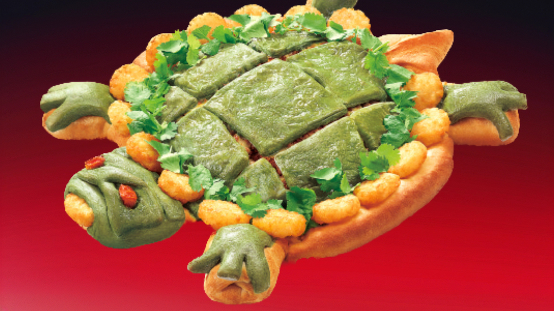 Pizza Hut Taiwan is serving up a pizza that’s more Cowabunga than the typical pepperoni and pineapple. First of all, it’s green. It’s also garnished with cilantro. Oh, and it has red eyes and webbed feet.