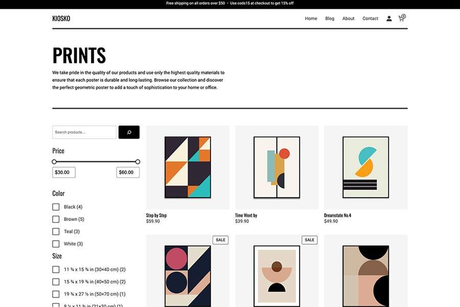 Here’s a minimal store theme for WooCommerce that puts your products in the spotlight. It features a black-and-white color scheme and bold typography. The default layout includes product filtering to enhance the customer experience. Since it’s a block theme, you can edit every aspect to match your needs. It’s also 100% free.