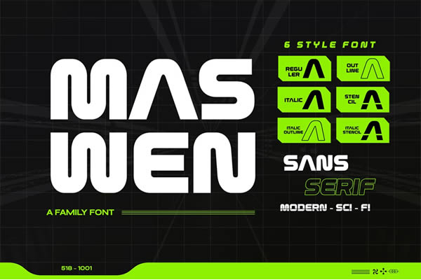 Maswen draws inspiration from space travel. Round and bold, it comes in regular, outline, and stencil styles. It is perfect for adding a modern touch to your projects.